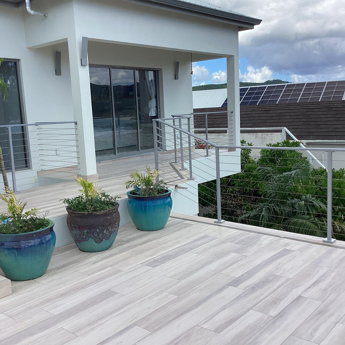 Garde-corps à câbles sur terrasse multi-niveaux avec vue tropicale à Antigua